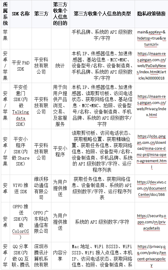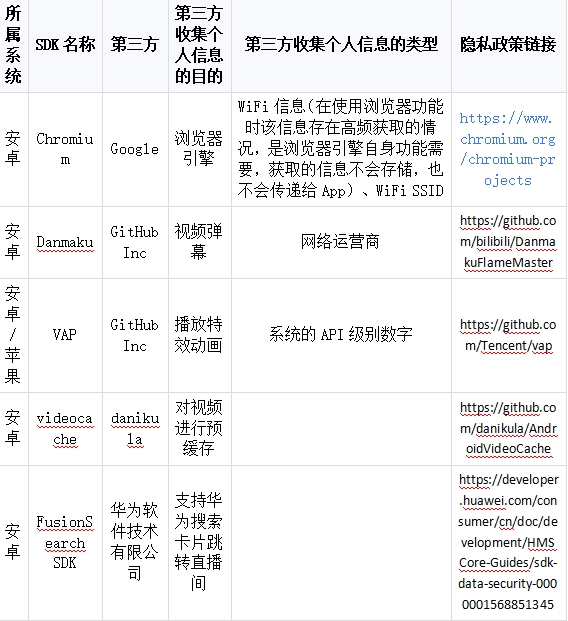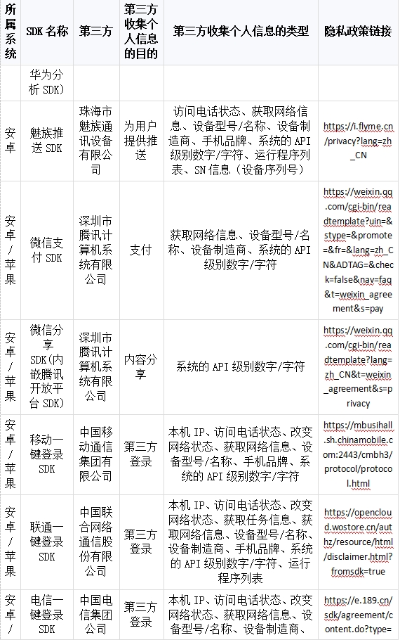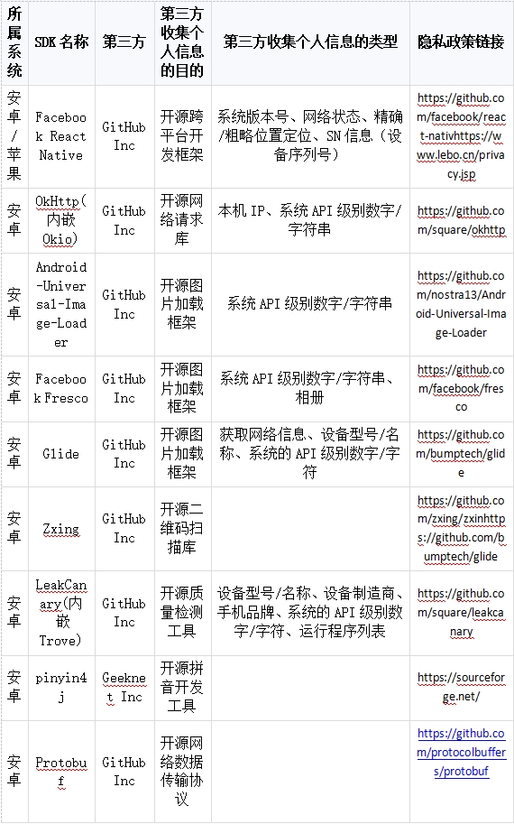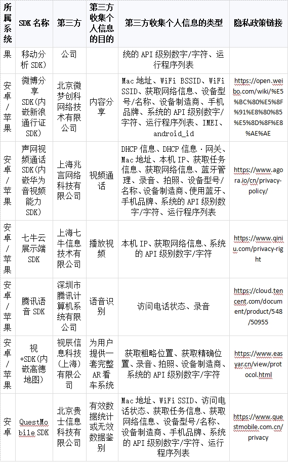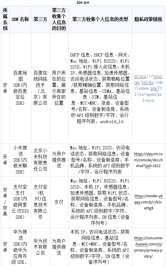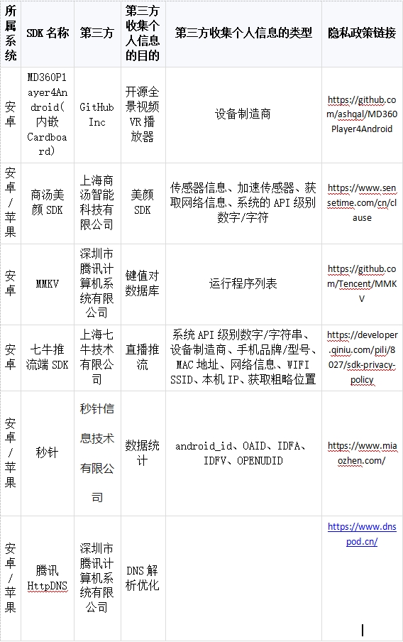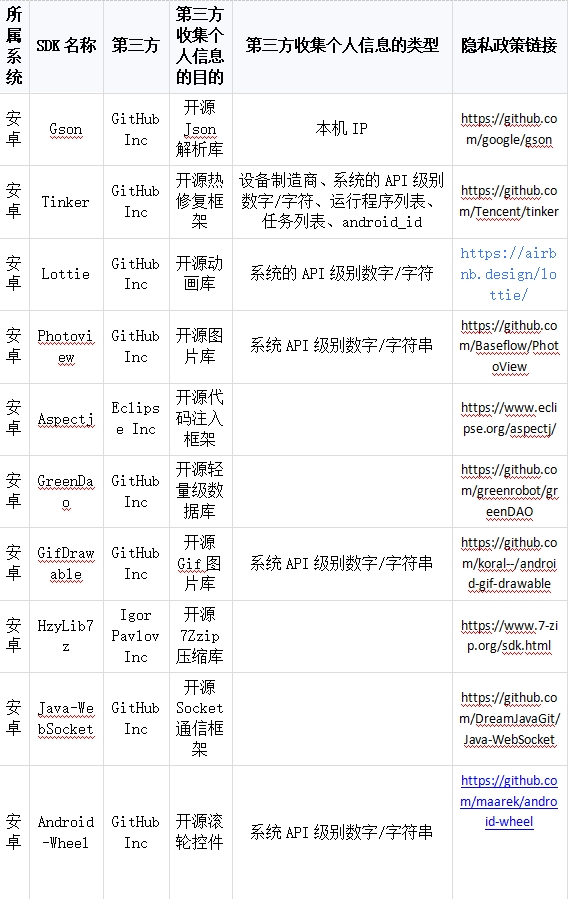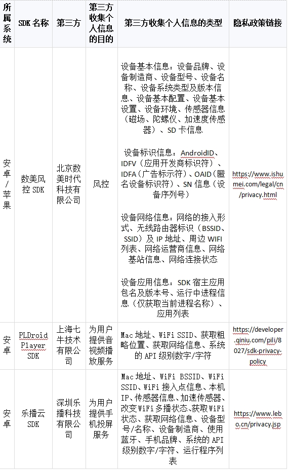 第三方SDK合作伙伴。SDK技术由与我们合作的第三方机构提供并由其直接收集您的个人信息。关于提供商的身份、收集个人信息的目的、方式、范围等情况,请您详见下图(具体共享信息的第三方,以APP实际页面为准)。